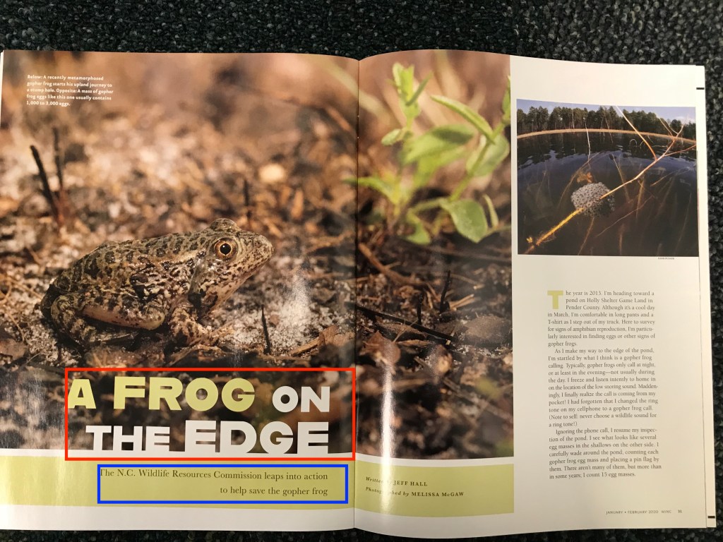 The weight of the type is also something to consider. We know the article is focusing on the frog simply due to the weight on the type by being heavy, all caps, and using color. The fact that the lead is in caps and the information is not does give balance to the structure. And, as our reading tells us yet again, by having the title in caps and the info in lower case we have a contrast of form. Oh the joy knowing they have created consistent contrast with their use of color, weight, structure, form, and direction. All the words are uniform in this area, creating a pleasing visual.