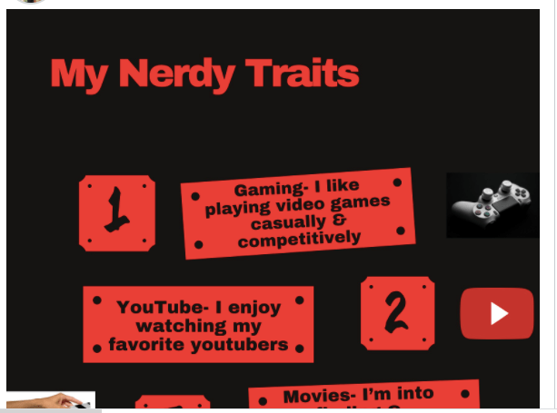 Tuesday: Please stay with the WoW: NERD, here you are to make a POSTER of yourself showing your classmates how you think you are a nerd. Show us your nerdiness! Make sure you are using the App in Canva to make this poster.