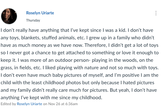 Roselyn when asked about having something old to give her advice, something that she kept since she was a young kid. One of my very engaged students, though sometimes late in posting, she always gave me insights into her situation that made us begin to have a relationship that will continue after she graduates. Some students do that. Let you in and when they do, it makes all the work worth it.