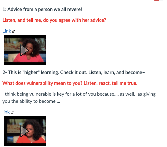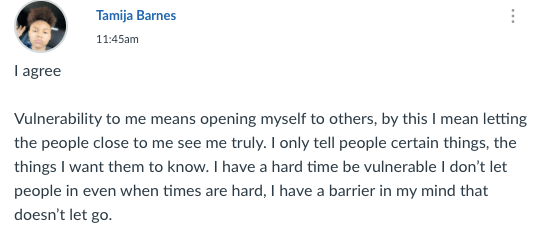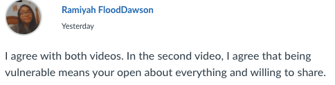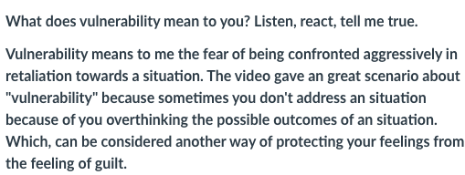 To that end, I think there were successes. To that end, there were failures. But you might want to judge for yourself. Here are a few examples of work I did not showcase before but are worthy of a look-see. This was a look at what they thought about the concept of “Vulnerability” and what that meant. I gave them a link to a quick SoulSunday with Oprah and Brene Brown. As well, they had a link to another SoulSunday with Oprah and Maya Angelou where she gave them advice on forgiveness. I asked them to relay to me their feelings and what they thought of the two videos. I was pleased and proud, like a puffed-up peacock, at what they came away with. This concept of Vulnerability is a huge component of students that feel isolated and alone, and not worthy of help. I wanted them to know that even adults have issues with being vulnerable, and that by learning that everyone needs to know how to handle their own situations gives them freedom to express and be who they are.