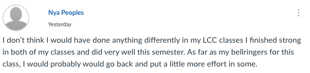 Some of the assignments required they go back, respond, and have conversations with one another. The main purpose here was to try and create a cohesive unit. Many of the kids were fully remote learners, thus have had no contact with any of their fellow students. This needed to be addressed. Isolation was real for many of them and the feeling of aloneness was a worry I had as some headed into a borderline towards anxiety and depression that needed to be alleviated. Many of the tasks that asked them to go back and respond to one another were not as well-received as I expected. Once or twice they would go in but with coercion on my part, and a little begging. However, some of them followed directions to a T and had no issues doing the requested work, while others moaned and groaned that I was asking too much from them. They especially remarked on how “I did not give them grades so why did they have to participate”? The conundrum did exist. I had those that worked under bribery, and others that just did it because I asked them to, or because they enjoyed the brain activity that happened with most of my BR’s and DB’s. Naturally, I had some stellar students who performed no matter what.